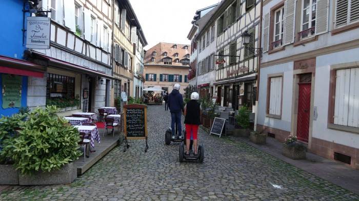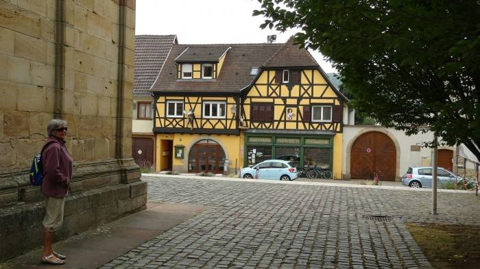 Vers midi, nous voici à Obersteinbach, petit village alsacien près de la frontière allemande. Nous désirons manger un petit quelque chose dans un restaurant et nous en trouvons un qui nous avait l'air bien voire un peu trop "smart" par rapport à notre habillement. D'ailleurs, lorsque nous avons vu des gens un peu snobs y entrer ainsi que les tarifs sur la carte, nous avons fait demi-tour et nous voici dans un resto vraiment sympa, comme nous les aimons.